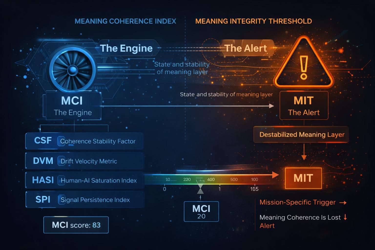 In my framework, the Meaning Coherence Index (MCI) is the mathematical engine that powers the Meaning Integrity Threshold (MIT). They’re related, but they’re not the same thing - and confusing them leads to brittle AI systems.