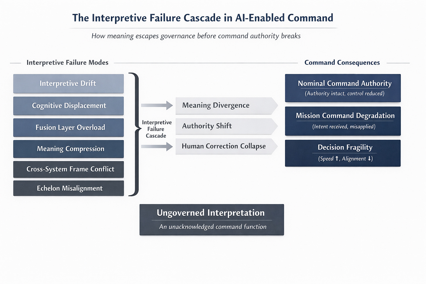 This paper maps how interpretation fails in AI-enabled command environments - and how those failures compound into mission command degradation and decision fragility before anyone notices.