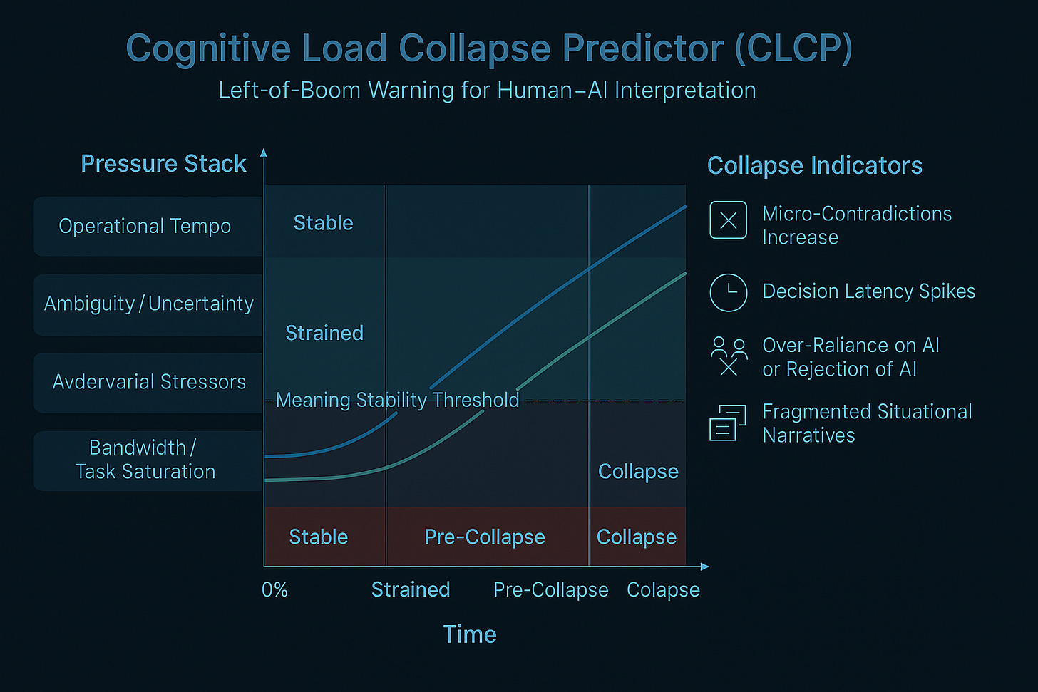 The Cognitive Load Collapse Predictor (CLCP) is a left-of-boom model for the cognitive battlespace. It tracks four pressure stacks: