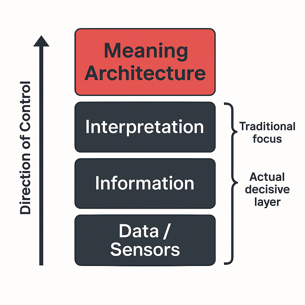 But the decisive terrain sits above them: Meaning Architecture, the layer where interpretation forms before any decision occurs.